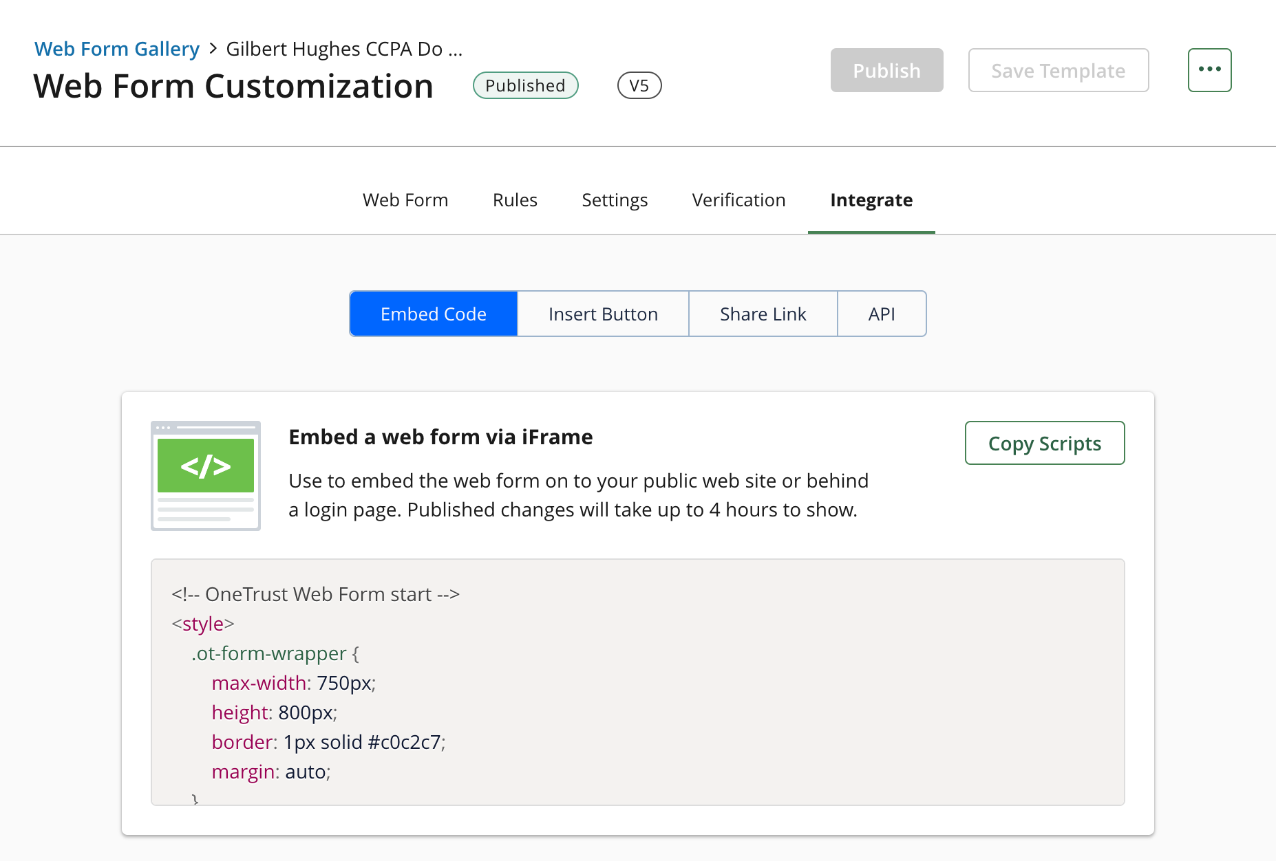 You can embed a web form into your site using a link or provide data subjects access to your organization's web form from a button. The Integrate tab within the Web Form Customization screen offers a few options for providing access to your organization's web form. Consult with your company's marketing and/or development team for assistance setting up site links.
