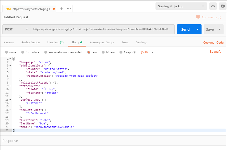 Create another call in Postman using the GET request status by Trace ID endpoint: GET /api/datasubject/v2/requestqueues/status/{traceId}
