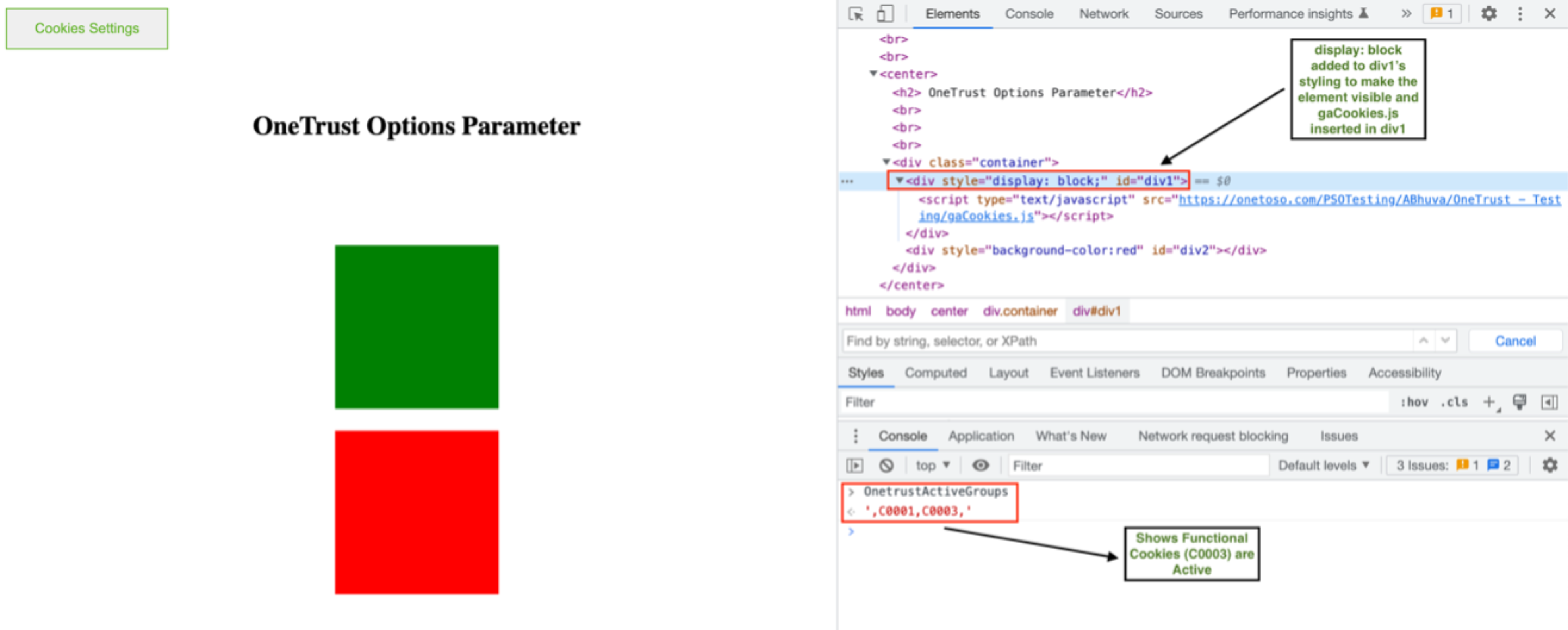 [en] In the above example, if the div1 element is hidden initially, then display: block will be added for that element. When Functional cookies are toggled off, the div1 element will not be visible. When a user consents to the Functional category, gaCookies.js will be inserted and the element will become visible since makeSelectorVisible is set to true.