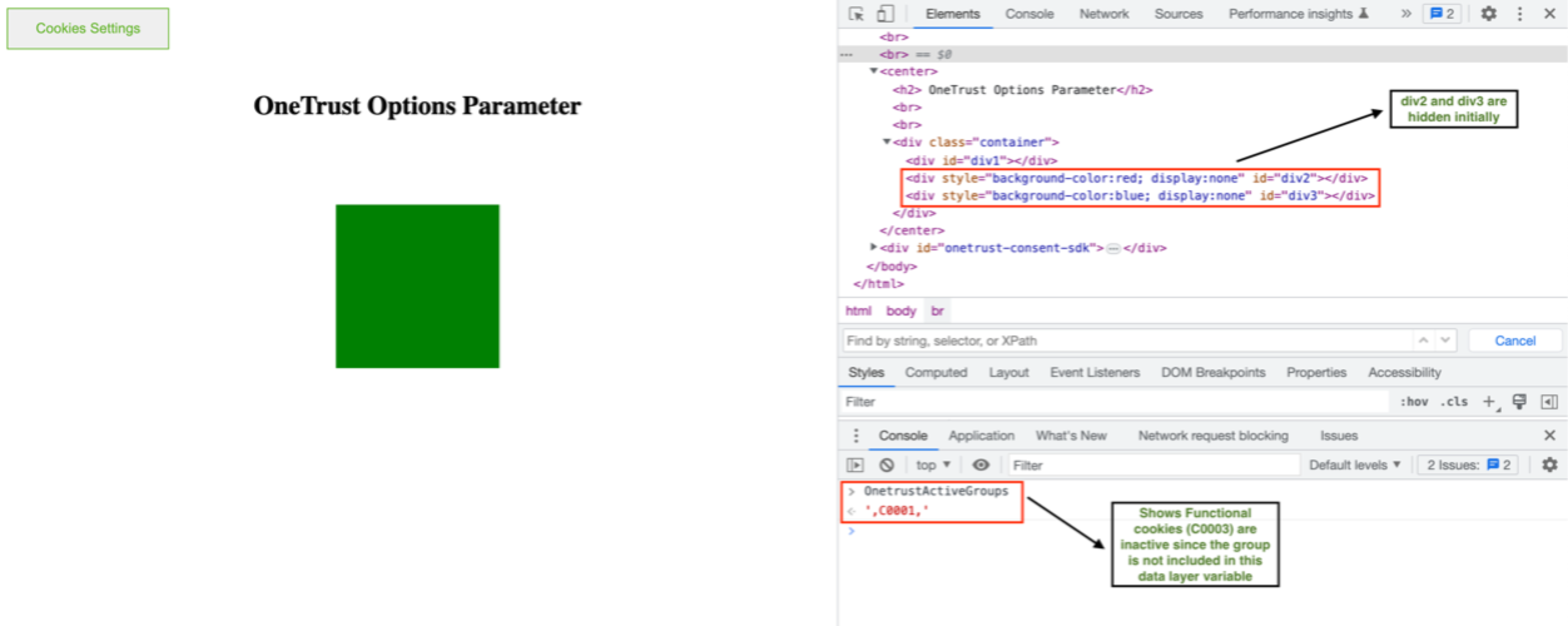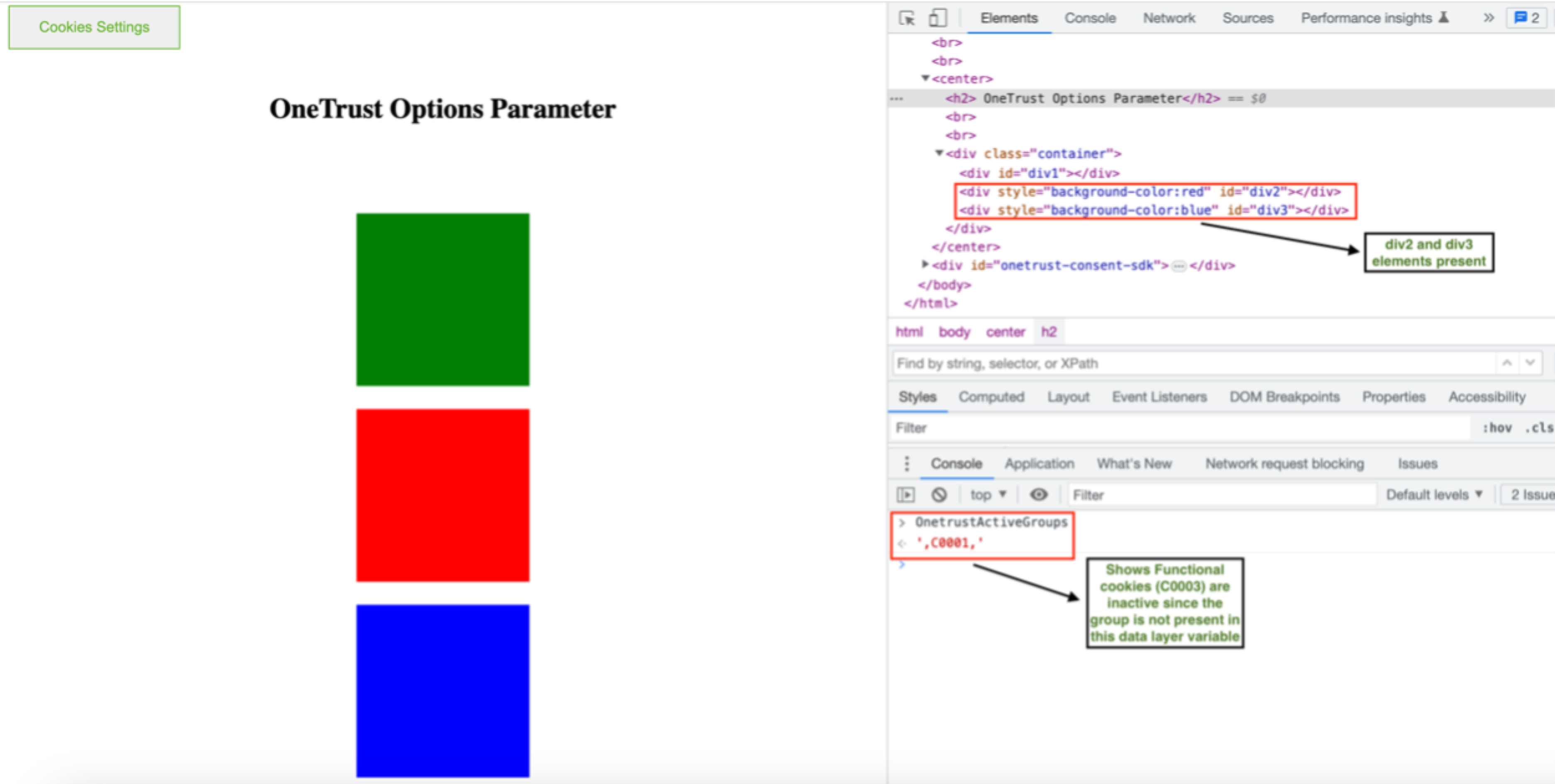 [en] In the above example, the OneTrust.InsertScript will insert gaCookies.js in the HTML element with ID div1 when a user consents to Functional cookies. Additionally, because the makeElementsVisible parameter is added, the elements in its array (div2 and div3) will be made visible if they were hidden initially.